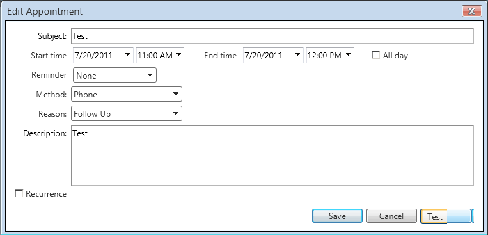 <rad:RadScheduler runat="server" ID="Scheduler" Width="753px" Height="600px" EnableExactTimeRendering="true" StartEditingInAdvancedForm="true" StartInsertingInAdvancedForm="true" DataKeyField="Schedule_id" DataStartField="Start" DataEndField="End" DataSubjectField="Subject" DataDescriptionField="Description" DataRecurrenceField="RecurrenceRule" DataReminderField="Reminder" DataRecurrenceParentKeyField="RecurrenceParentSchedule_id" AppointmentContextMenuSettings-EnableDefault="false" TimeSlotContextMenuSettings-EnableDefault="false" TimelineView-UserSelectable="false" > <AdvancedForm Modal="true" /> <Reminders Enabled="True" /></rad:RadScheduler>Also I'm using 2011.1.519.40 of the dll.