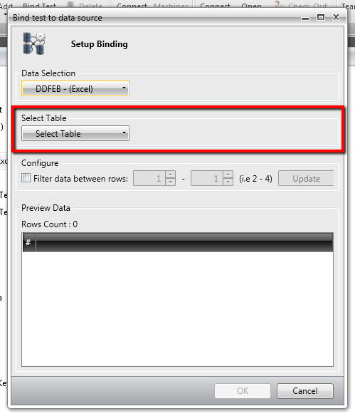 I created Data Sources (excel) for the project. I have a "Web Test" that I am trying to "Bind Test" . When I click "Bind Test", it opens "Bind Test to Data Source" dialog box...but when I try to click the "Select Data Source" drop down...nothing displays..it blinks and turns orange color...