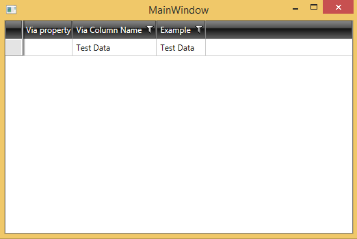 <Window x:Class="RadGridViewTest.MainWindow" xmlns:telerik="http://schemas.telerik.com/2008/xaml/presentation" xmlns:radGridViewTest="clr-namespace:RadGridViewTest" Title="MainWindow" Height="350" Width="525"> <Window.Resources> <radGridViewTest:ContextData x:Key="ContextData"/> </Window.Resources> <Grid DataContext="{StaticResource ContextData}"> <telerik:RadGridView ItemsSource="{Binding Path=ExampleTable}" AutoGenerateColumns="True" ShowGroupPanel="False"> <telerik:RadGridView.Columns> <telerik:GridViewDataColumn DataMemberBinding="{Binding ExampleColumn}" Header="Via property"/> <telerik:GridViewDataColumn DataMemberBinding="{Binding Example}" Header="Via Column Name"/> </telerik:RadGridView.Columns> </telerik:RadGridView> </Grid></Window>​