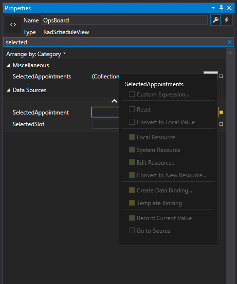 I am using a custom AppointmentSelectionBehaviour to prevent the user from selecting Appointments with more than 2 different resource types. This works correctly. The problem is that I wish to bind to the selected appointments. There is a property on the RadScheduleView called "SelectedAppointments" but I am not able to bind to it. Am I doing something wrong? I want to be able to modify the selected appointments in my view model.