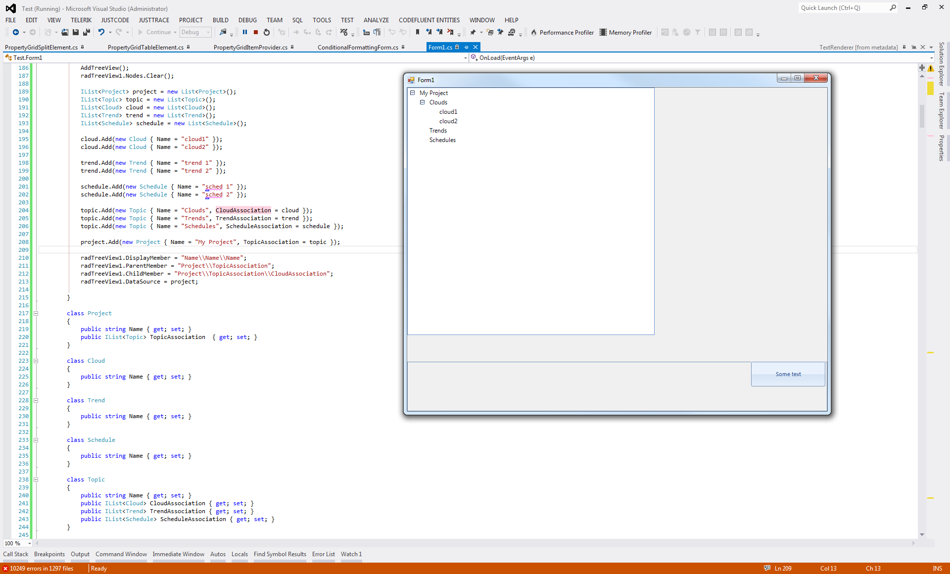 IList<Project> project = new List<Project>();IList<Topic> topic = new List<Topic>();IList<Cloud> cloud = new List<Cloud>();IList<Trend> trend = new List<Trend>();IList<Schedule> schedule = new List<Schedule>();cloud.Add(new Cloud { Name = "cloud1" });cloud.Add(new Cloud { Name = "cloud2" });trend.Add(new Trend { Name = "trend 1" });trend.Add(new Trend { Name = "trend 2" });schedule.Add(new Schedule { Name = "sched 1" });schedule.Add(new Schedule { Name = "sched 2" });topic.Add(new Topic { Name = "Clouds", CloudAssociation = cloud });topic.Add(new Topic { Name = "Trends", TrendAssociation = trend });topic.Add(new Topic { Name = "Schedules", ScheduleAssociation = schedule });//Project.project.Add(new Project { Name = "My Project", TopicAssociation = topic });radTreeView1.DisplayMember = "Name\\Name\\Name";radTreeView1.ParentMember = "Project\\TopicAssociation";radTreeView1.ChildMember = "Project\\TopicAssociation\\CloudAssociation";radTreeView1.DataSource = project;
