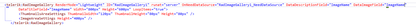 <telerik:RadImageGallery ID="RadImageGallery1" runat="server" OnNeedDataSource="RadImageGallery1_NeedDataSource" DataDescriptionField="Description" DataImageField="Picture" DataTitleField="CategoryName" LoopItems="true"></telerik:RadImageGallery>C#: