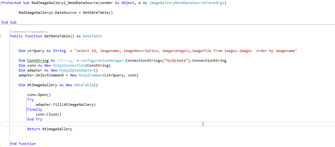 protected void RadImageGallery1_NeedDataSource(object sender, ImageGalleryNeedDataSourceEventArgs e){ RadImageGallery2.DataSource = GetDataTable();}public DataTable GetDataTable(){ string query = "SELECT [Picture], [Description], [CategoryName] FROM [Categories]"; String ConnString = ConfigurationManager.ConnectionStrings["ConnectionString"].ConnectionString; SqlConnection conn = new SqlConnection(ConnString); SqlDataAdapter adapter = new SqlDataAdapter(); adapter.SelectCommand = new SqlCommand(query, conn); DataTable dtImageGallery = new DataTable(); conn.Open(); try { adapter.Fill(dtImageGallery); } finally { conn.Close(); } return dtImageGallery;}Thanks,