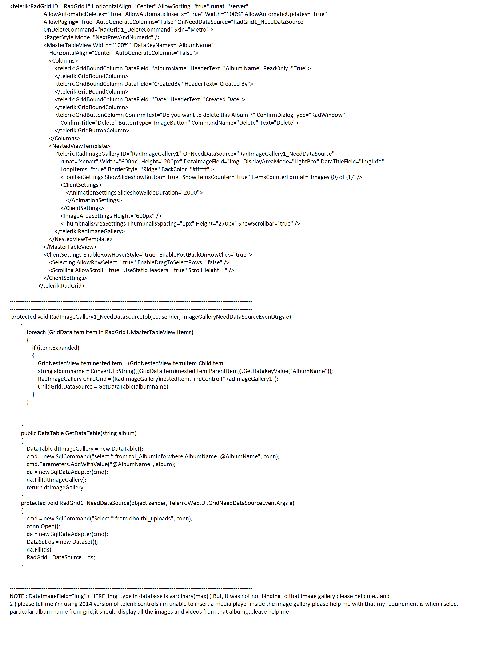 I have a rad grid with columns Album name,Created by.and records three are there.when i expand that album name,that nested view template (image gallery) will appears. that particular album name images from database should be bind to rad image gallery.that images are in binary format.what to do??? please help me guyzzzz...i want it immediately.please please