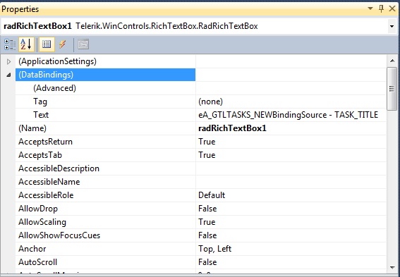 I am trying to get a RadRichTextBox to be automatically populated with the contents of a field from an Oracle database. I have set up the properties in the same way that I would for a regular Windows Forms Rich Text Box - by setting the DataBindings Text property to be the BindingSource followed by the field name.