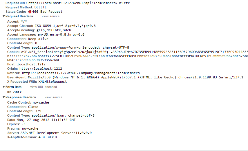 And I've attached a picture with my http request, the response is: {"Message":"The request is invalid.","MessageDetail":"The parameters dictionary contains a null entry for parameter 'ID' of non-nullable type 'System.Int64' for method 'System.Object Delete(Int64)' in 'Signuper.WebApp.Areas.API.Company.Controllers.TeamMembersController'. An optional parameter must be a reference type, a nullable type, or be declared as an optional parameter."} One final thing to note is that i first named the parameter on the web api method and in the parameter map UserID instead of ID as it is now. When it's like that I get a different webAPI error saying simply that no webAPI method that matches my parameters can be found.