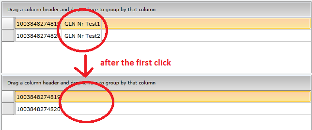 <telerik:RadGridView ShowColumnHeaders="False" AutoGenerateColumns="False" IsBusy="{Binding bIsDataLoading}" SelectedItem="{Binding SelectedDataItem,Mode=TwoWay}" ItemsSource="{Binding tab_Data}" Name="grdOverview" HorizontalAlignment="Left" VerticalAlignment="Top" Width="640" Height="350" Margin="0,50,0,0"> <telerik:RadGridView.Columns> <telerik:GridViewDataColumn IsVisible="{Binding bsColumn1}" DataMemberBinding="{Binding S1}" Width="{Binding iWidthsColumn1}" /> <telerik:GridViewDataColumn IsVisible="{Binding bsColumn2}" DataMemberBinding="{Binding S2}" Width="{Binding iWidthsColumn2}" /> <telerik:GridViewDataColumn IsVisible="False" DataMemberBinding="{Binding S3}" Width="{Binding iWidthsColumn3}" /> </telerik:RadGridView.Columns> </telerik:RadGridView> In the ViewModel I initialize for example "S2=false" and call then "this.OnPropertyChanged(p => p.S2)" for my variable. After that I show the window with the GridView, but the column is still displayed! When I click onto the column the first time the data is deleted, when I click a second time the data gets visible. It looks crazy! If I set the property "IsVisible=false" without a binding the column is not shown and it works.