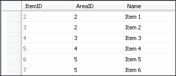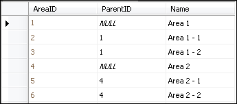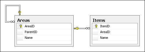 I have two tables in a database (See attached photo EntityRelationship.png). The table called Areas is self-referencing and the table called Items references Areas. The data in each table is shown in AreaTableData.png and ItemTableData.png. The hierarchy should look like this:
