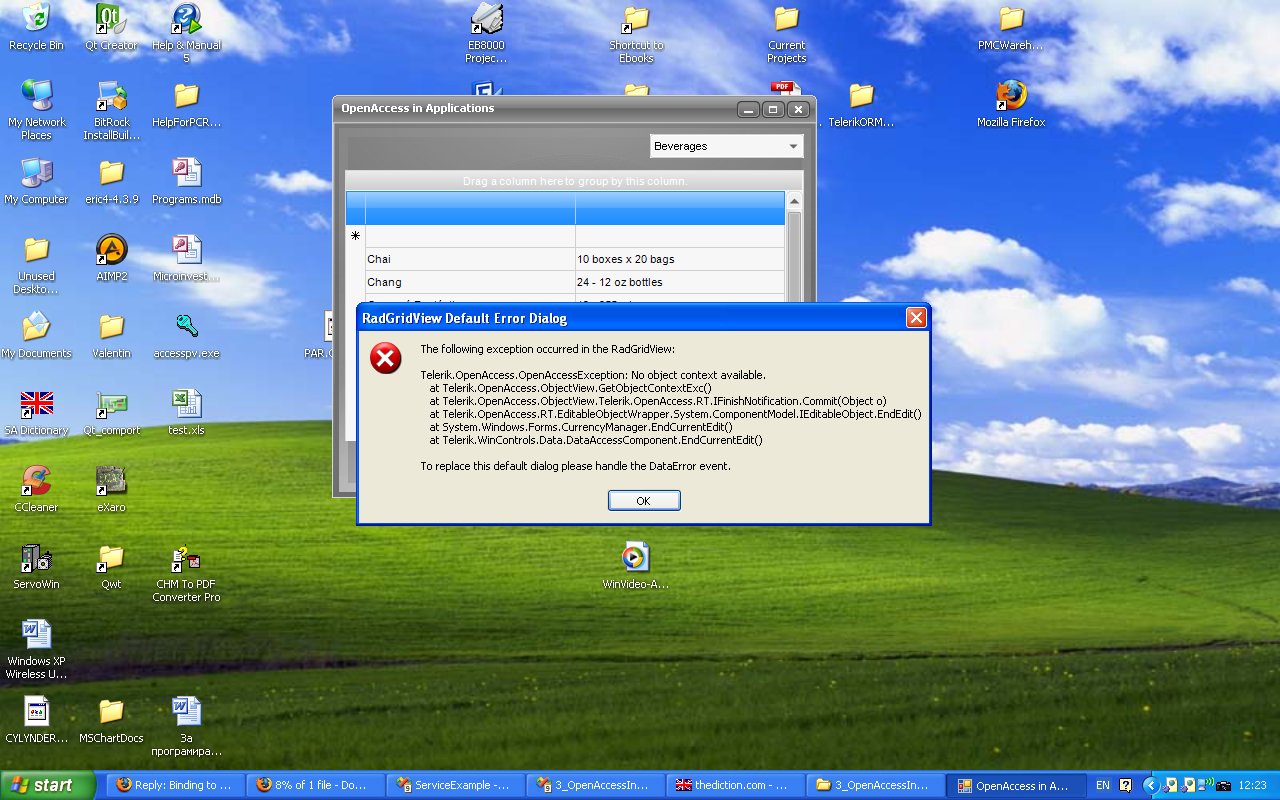 "2B_MyWinFormCrud" . The telerik winform controls is 2009 Q1 I think, but the OpenAccessExpress is 2009 Q3 (the last version). I'll send you an image with the exception. I didn't change anything in Falafel's project except the connection string and I followed the steps as they were written. As I said, updating data is Ok, so I have connection to the database. The problem is when I add new row, enter some values and try to leave the row. Validation fails for some reason...