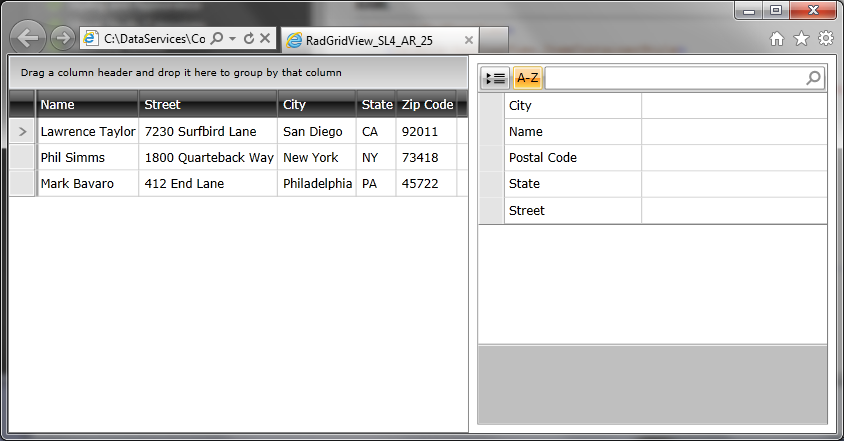 <UserControl x:Class="RadGridView_SL4_AR_25.MainPage" xmlns:telerik="http://schemas.telerik.com/2008/xaml/presentation" xmlns:my="clr-namespace:RadGridView_SL4_AR_25" xmlns:telerikQuickStart="clr-namespace:Telerik.Windows.Controls.QuickStart;assembly=Telerik.Windows.Controls" mc:Ignorable="d" d:DesignHeight="700" d:DesignWidth="700"> <UserControl.Resources> <my:MyViewModel x:Key="MyViewModel"/> </UserControl.Resources> <Grid x:Name="LayoutRoot" Background="White" DataContext="{StaticResource MyViewModel}"> <Grid.RowDefinitions> <RowDefinition Height="*"/> </Grid.RowDefinitions> <Grid.ColumnDefinitions> <ColumnDefinition Width="*" /> <ColumnDefinition Width="350" /> </Grid.ColumnDefinitions> <telerik:RadGridView Name="myGrid" ItemsSource="{Binding GridItems, Mode=TwoWay}" SelectionChanged="myGrid_SelectionChanged" CanUserSortColumns="True" IsReadOnly="True" ShowGroupPanel="True" Loaded="myGrid_Loaded" AutoGenerateColumns="False"> <telerik:RadGridView.Columns> <telerik:GridViewDataColumn DataMemberBinding="{Binding Columns[0]}" Header="Name" UniqueName="Customer_Name" /> <telerik:GridViewDataColumn DataMemberBinding="{Binding Columns[1]}" Header="Street" UniqueName="Customer_Street" /> <telerik:GridViewDataColumn DataMemberBinding="{Binding Columns[2]}" Header="City" UniqueName="Customer_City" /> <telerik:GridViewDataColumn DataMemberBinding="{Binding Columns[3]}" Header="State" UniqueName="Customer_State" /> <telerik:GridViewDataColumn DataMemberBinding="{Binding Columns[4]}" Header="Zip Code" UniqueName="Customer_ZipCode" /> </telerik:RadGridView.Columns> </telerik:RadGridView> <telerik:RadPropertyGrid x:Name="RadPropertyGrid1" Item="{Binding SelectedItem, ElementName=myGrid, Mode=TwoWay}" Margin="8" LabelColumnWidth="130" Grid.Column="1" AutoGeneratePropertyDefinitions="False"> <telerik:RadPropertyGrid.PropertyDefinitions> <telerik:PropertyDefinition DisplayName="Name" Binding="{Binding Columns[0]}" /> <telerik:PropertyDefinition DisplayName="Street" Binding="{Binding Columns[1]}" /> <telerik:PropertyDefinition DisplayName="City" Binding="{Binding Columns[2]}" /> <telerik:PropertyDefinition DisplayName="State" Binding="{Binding Columns[3]}" /> <telerik:PropertyDefinition DisplayName="Postal Code" Binding="{Binding Columns[4]}" /> </telerik:RadPropertyGrid.PropertyDefinitions> </telerik:RadPropertyGrid> </Grid></UserControl>