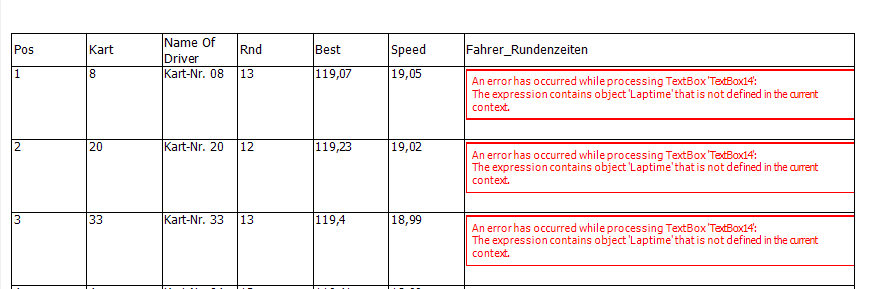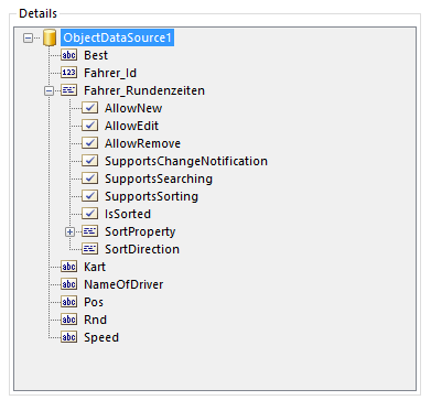 Function ReadTicketWithTimesXml(xmlfile As String) Dim ds As New DataSet xmlfile = "e:/karatris/LTR.xml" ds.ReadXml(xmlfile) Return ds.Tables("Fahrer") End Functionand use this function as a source for an objectdatasource all values can be used in a report except the <Rundenzeiten> <Laptime> values.