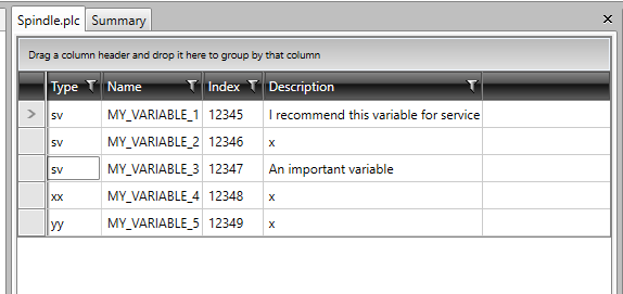 <Grid xmlns:telerik="http://schemas.telerik.com/2008/xaml/presentation"> <Grid.RowDefinitions> <RowDefinition Height="Auto"/> <RowDefinition Height="*"/> </Grid.RowDefinitions> <telerik:RadGridView Grid.Row="0" ItemsSource="{Binding Variables}" GroupRenderMode="Nested" AutoExpandGroups="True" AutoGenerateColumns="False"> <telerik:RadGridView.Columns> <telerik:GridViewDataColumn DataMemberBinding="{Binding Type}" Header="Type" IsGroupable="True"/> <telerik:GridViewDataColumn DataMemberBinding="{Binding Name}" Header="Name" IsGroupable="False"/> <telerik:GridViewDataColumn DataMemberBinding="{Binding Index}" Header="Index"/> <telerik:GridViewDataColumn DataMemberBinding="{Binding BriefDescription}" Header="Description" IsGroupable="True"/> </telerik:RadGridView.Columns> <telerik:RadGridView.GroupDescriptors> <telerik:GroupDescriptor Member="BriefDescription" SortDirection="Ascending" /> </telerik:RadGridView.GroupDescriptors> </telerik:RadGridView> </Grid>Any ideas?