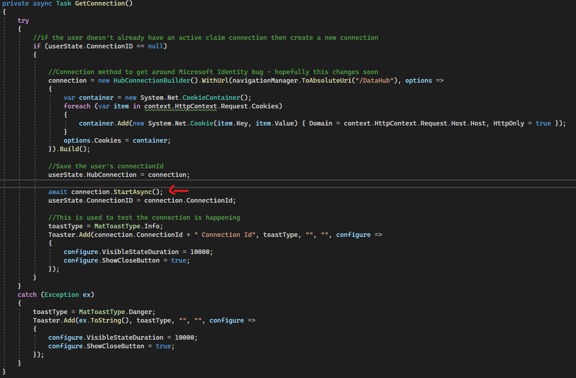 Since I am using SignalR to refresh user data in a large portion of my app, I'm currently at a standstill with debugging any new errors.
