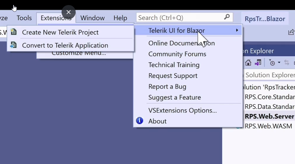 In the training I see this comping up, I installed Telerik using the msi file, i do not have this Extension option.