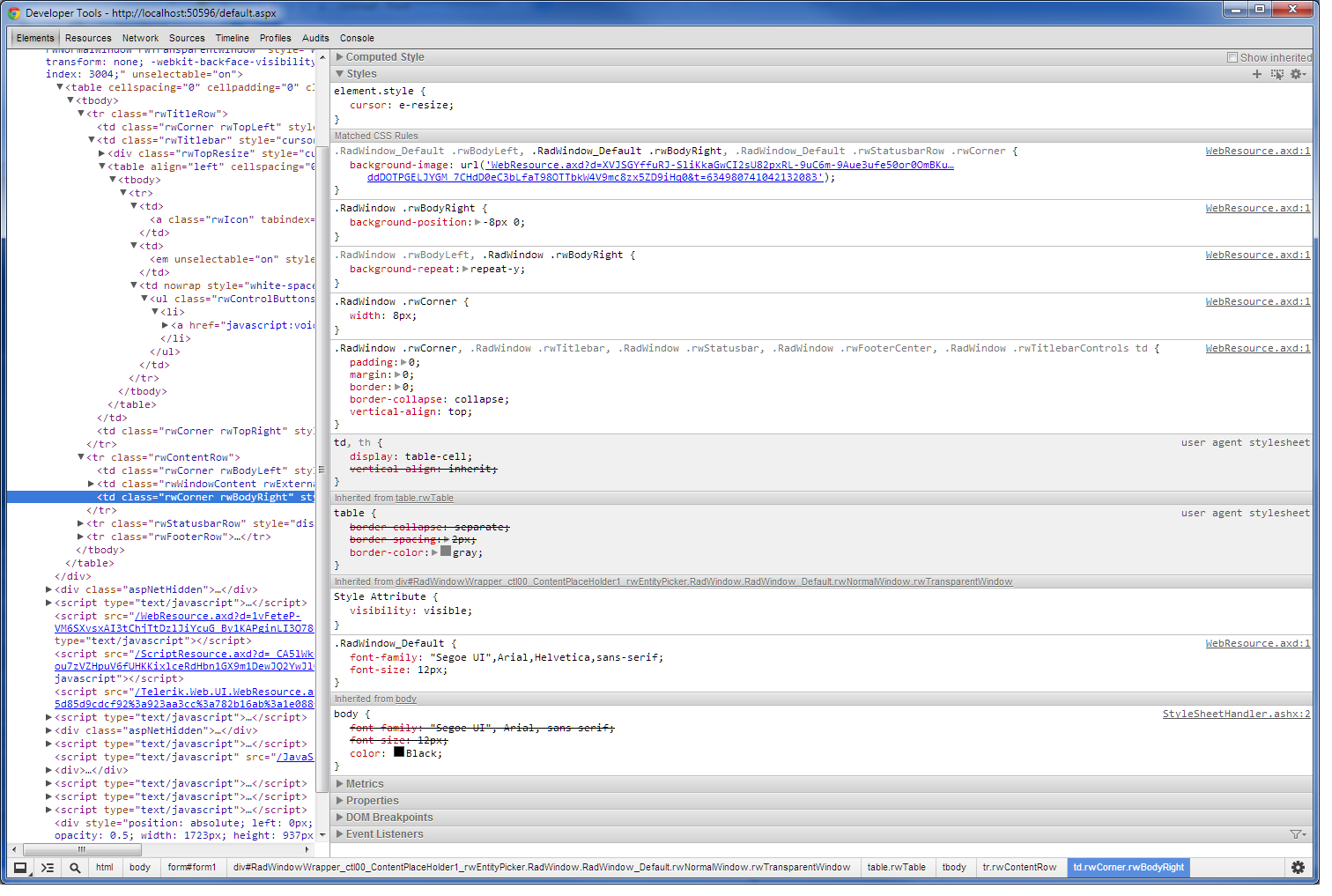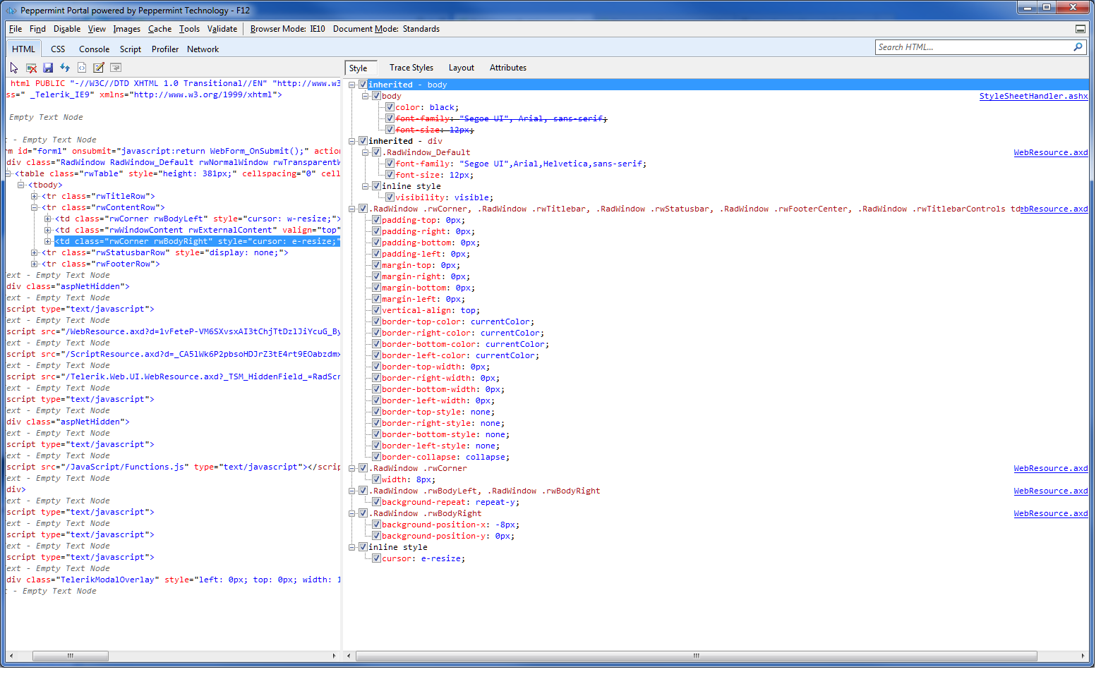 I have attached two screenshots of the dev tools for IE 10 and Chrome to show the difference in the rendered CSS. It seems that (in this case, the right border of the pop-up window) the resource is not being rendered though the table cell is, but looks fine in chrome.