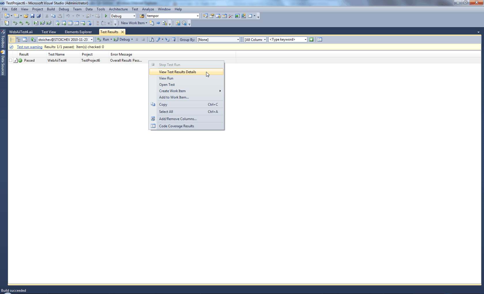 Screen capture: CaptureType can be Desktop or Browser. FileNamePrefix is "Snapshot" bydefault. Important note!: To make screen capture work you cannot run the test using the "QuickExecute button". Instead, run the test from the Visual Studio Test menu. You can use the Visual Studiomenu Test > Windows > Test View, right-click your WebAii Test and select Run Selection from thecontext menu.