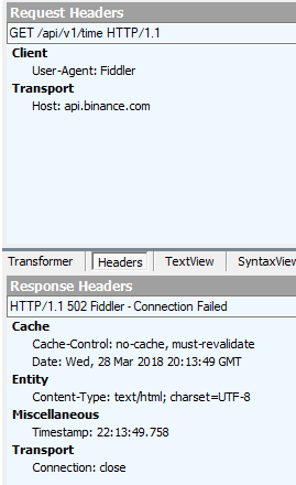 Browsing to the api https://api.binance.com/api/v1/time returns the appropiate JSON data while using fiddlers composer with standard settings (also tried no proxy) returns 502.