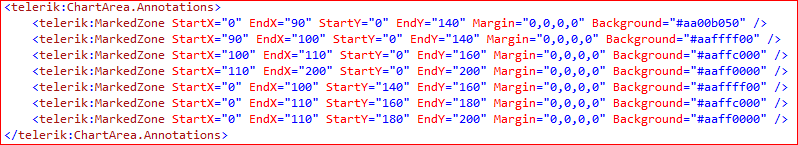 The reason why this "gap" appears in the beginning and in the end of the PlotArea is that the LayoutMode of the XAxis is set to Between by dafault. Change it to Normal and you'll have your MarkedZones to appear as required. You can read more about this property here.