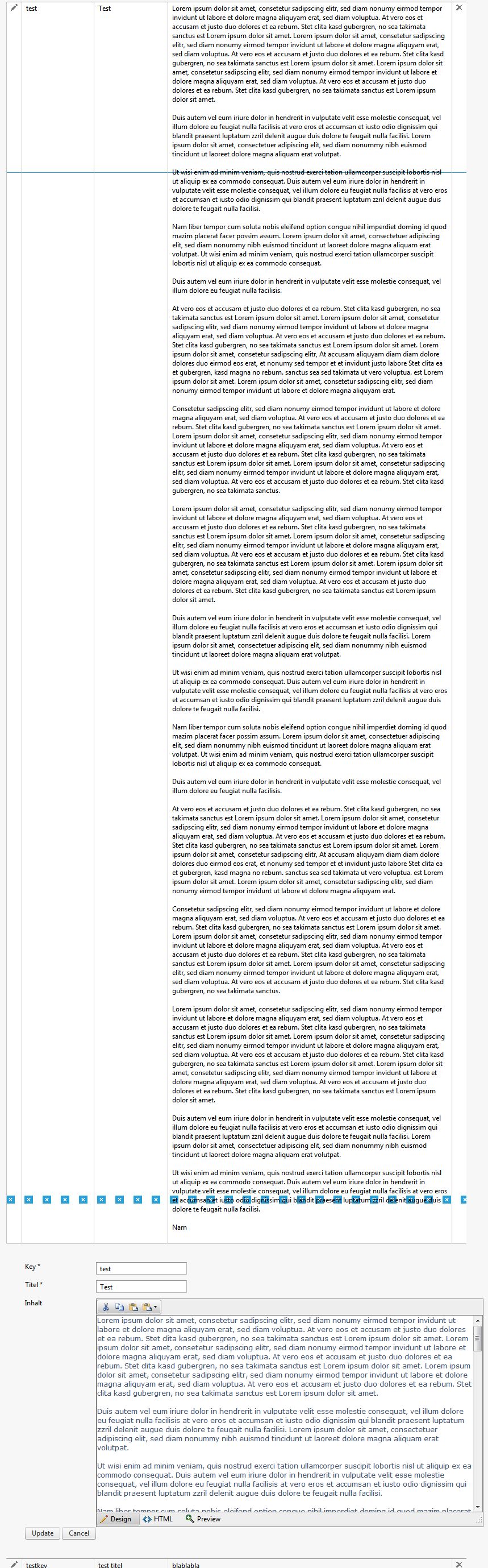 <telerik:RadGrid ID="RadGrid1" runat="server" DataSourceID="SqlDataSource1" Skin="Metro" PageSize="7" AllowSorting="True" AllowPaging="True" AllowAutomaticInserts="True" AllowAutomaticDeletes="True" AllowAutomaticUpdates="True" AutoGenerateColumns="False" OnItemDataBound="RadGrid1_ItemDataBound" CellSpacing="0" GridLines="None"> <PagerStyle Mode="NextPrevAndNumeric" /> <ClientSettings> <Selecting AllowRowSelect="True" /> </ClientSettings> <MasterTableView HeaderStyle-CssClass="rgrid_header" CommandItemDisplay="Top" InsertItemDisplay="Top" DataSourceID="SqlDataSource1" DataKeyNames="contentId"> <RowIndicatorColumn Visible="True" FilterControlAltText="Filter RowIndicator column"></RowIndicatorColumn> <ExpandCollapseColumn Visible="True" FilterControlAltText="Filter ExpandColumn column"></ExpandCollapseColumn> <Columns> <telerik:GridEditCommandColumn ButtonType="ImageButton" ItemStyle-VerticalAlign="Top" HeaderStyle-Width="10px" /> <telerik:GridBoundColumn DataField="contentId" UniqueName="contentId" HeaderText="ID" HeaderStyle-Font-Bold="true" DataType="System.Int32" SortExpression="contentId" ReadOnly="True" ItemStyle-VerticalAlign="Top" Visible="false"> </telerik:GridBoundColumn> <telerik:GridBoundColumn DataField="content" FilterControlAltText="Filter content column" HeaderText="Inhalt" HeaderStyle-Font-Bold="true" SortExpression="content" UniqueName="content" ItemStyle-VerticalAlign="Top"> </telerik:GridBoundColumn> </Columns> <EditFormSettings EditFormType="Template"> <EditColumn UniqueName="EditCommandColumn1" FilterControlAltText="Filter EditCommandColumn1 column"></EditColumn> <FormTemplate> <div class="column1"><p>Inhalt</p></div> <div class="column2"> <telerik:RadEditor ID="RadEditor1" runat="server" Content='<%# Bind("content") %>' Skin="Metro" Width="100%"> <Content></Content> <Tools> <telerik:EditorToolGroup Tag="MainToolbar"> <telerik:EditorTool Name="Cut"></telerik:EditorTool> <telerik:EditorTool Name="Copy"></telerik:EditorTool> <telerik:EditorTool Name="Paste" ShortCut="CTRL+V"></telerik:EditorTool> <telerik:EditorTool Name="PasteStrip" /> </telerik:EditorToolGroup> </Tools> </telerik:RadEditor><br /> </div> <div class="clear"></div> <div class="column1"> </div> <div class="column2"> <div class="editbuttons"> <telerik:RadButton ID="btn_update" runat="server" OnClick="btn_update_Click" Text='<%# (Container is GridEditFormInsertItem) ? "Insert" : "Update" %>' CommandName='<%# (Container is GridEditFormInsertItem) ? "PerformInsert" : "Update" %>' ></telerik:RadButton> <telerik:RadButton ID="btn_cancel" Text="Cancel" runat="server" CausesValidation="False" CommandName="Cancel" ></telerik:RadButton> </div> </div> <div class="clear"></div> </FormTemplate> </EditFormSettings> <CommandItemSettings AddNewRecordText="Neuer Eintrag" AddNewRecordImageUrl="/edit/img/add.png" RefreshImageUrl="/edit/img/refresh.png"></CommandItemSettings> <PagerStyle PageSizeControlType="RadComboBox"></PagerStyle> </MasterTableView> <FilterMenu EnableImageSprites="False"></FilterMenu></telerik:RadGrid>And the error is seen again with long text(!) in EditMode or a SelectedRow. See JPG, the blue graphics of Metro.
