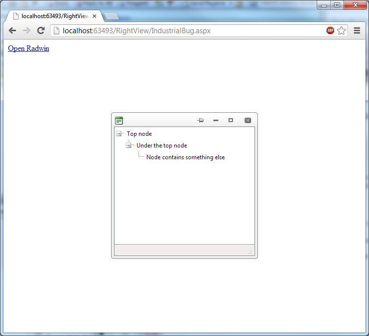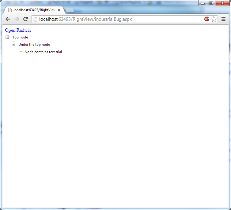<%@ Page Language="VB" AutoEventWireup="false" CodeFile="IndustrialBug.aspx.vb" Inherits="IndustrialBug" %><!DOCTYPE html PUBLIC "-//W3C//DTD XHTML 1.0 Transitional//EN" "http://www.w3.org/TR/xhtml1/DTD/xhtml1-transitional.dtd"><html xmlns="http://www.w3.org/1999/xhtml"><head runat="server"> <title></title></head><body> <form id="form1" runat="server"> <telerik:RadScriptManager ID="rsManager" runat="server"></telerik:RadScriptManager> <asp:LinkButton ID="cmdOpen" runat="server">Open Radwin</asp:LinkButton> <telerik:RadWindow ID="rwinSelectStores" runat="server" > <ContentTemplate> <telerik:RadTreeView ID="rtvStores" runat="server"> <Nodes> <telerik:RadTreeNode Text="Top node" Expanded="true"> <Nodes> <telerik:RadTreeNode Text="Under the top node" Expanded="true"> <Nodes> <telerik:RadTreeNode Text="Node contains trial" Expanded="true"></telerik:RadTreeNode> </Nodes> </telerik:RadTreeNode> </Nodes> </telerik:RadTreeNode> </Nodes> </telerik:RadTreeView> </ContentTemplate> </telerik:RadWindow> </form></body></html>code-behind: