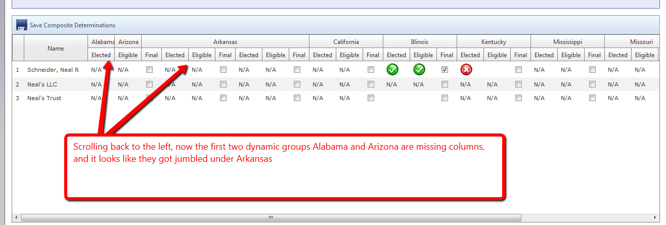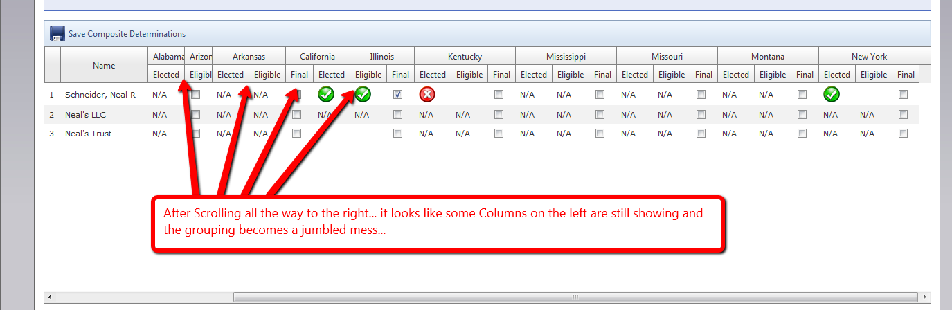 var rg = new RadGrid(); rg.Skin = "Default"; rg.NeedDataSource += rg_NeedDataSource; rg.ID = "rgStateComp"; rg.Width = Unit.Pixel(1280); rg.ClientSettings.Scrolling.AllowScroll = true; rg.ClientSettings.Scrolling.UseStaticHeaders = true; rg.ClientSettings.Scrolling.FrozenColumnsCount = 2; rg.AllowPaging = false; rg.AutoGenerateColumns = false; rg.MasterTableView.DataKeyNames = new string[] { "InvestorID" }; // Get the State Filings var stateFilings = from s in StateAndStateFiling.GetStateFilingsForEngagementEntity(this.EngagementEntityID) where s.Filing.Active where s.Filing.Composite select new { s.State.StateID, s.State.Name }; GridBoundColumn boundColumn; boundColumn = new GridBoundColumn(); boundColumn.HeaderStyle.HorizontalAlign = HorizontalAlign.Center; boundColumn.DataField = "GoSystemsID"; rg.MasterTableView.Columns.Add(boundColumn); boundColumn = new GridBoundColumn(); boundColumn.HeaderStyle.HorizontalAlign = HorizontalAlign.Center; boundColumn.DataField = "Name"; boundColumn.HeaderText = "Name"; rg.MasterTableView.Columns.Add(boundColumn); foreach (var state in stateFilings) { var group = new GridColumnGroup(); group.Name = state.StateID.ToString(); group.HeaderStyle.HorizontalAlign = HorizontalAlign.Center; group.HeaderText = state.Name; rg.MasterTableView.ColumnGroups.Add(group); // Create the Three Template Columns for the States and to the DataTable // Add NA to the DataTable this.StateTable.Columns.Add(string.Format("NA{0}", state.StateID), typeof(bool)); // Elected var elected = new GridTemplateColumn(); var electedName = string.Format("Elected{0}", state.StateID); this.StateTable.Columns.Add(electedName); elected.ItemTemplate = new IndicatorTemplate(state.StateID, "Elected"); elected.HeaderStyle.HorizontalAlign = HorizontalAlign.Center; elected.HeaderText = "Elected"; elected.UniqueName = elected.DataField = electedName; elected.ColumnGroupName = group.Name; rg.MasterTableView.Columns.Add(elected); // Eligibility var eligible = new GridTemplateColumn(); var eligibleName = string.Format("Eligible{0}", state.StateID); this.StateTable.Columns.Add(eligibleName); eligible.ItemTemplate = new IndicatorTemplate(state.StateID, "Eligible"); eligible.HeaderStyle.HorizontalAlign = HorizontalAlign.Center; eligible.HeaderText = "Eligible"; eligible.UniqueName = eligible.DataField = eligibleName; eligible.ColumnGroupName = group.Name; rg.MasterTableView.Columns.Add(eligible); // Final var final = new GridTemplateColumn(); var finalName = string.Format("Final{0}", state.StateID); this.StateTable.Columns.Add(finalName, typeof(bool)); final.ItemTemplate = new CheckboxTemplate(state.StateID); final.HeaderStyle.HorizontalAlign = HorizontalAlign.Center; final.HeaderText = "Final"; final.UniqueName = final.DataField = finalName; final.ColumnGroupName = group.Name; rg.MasterTableView.Columns.Add(final); } // Add the Rad Grid to the Placeholder this.phStateCompGrid.Controls.Add(rg);Unfortunately, Frozen columns and multi-column grouped headers is a an unsupported scenario in RadGrid.