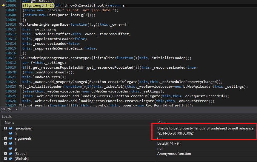 The rendering script has the value of "g" being null when attempting to parse the date and the appointments never bind and the Scheduler breaks with the exception shown in the Locals list in my screenshot. I would hate to have to revert back to using the old format.