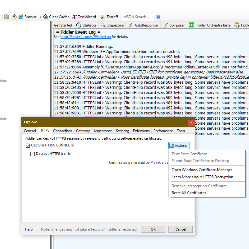 Alternatively, other user's have reported that removing the Fiddler Root Certificate from the Windows Certificate Store and then re-enabling Decryption has worked. To clear the Installed Certificates follow the below steps.