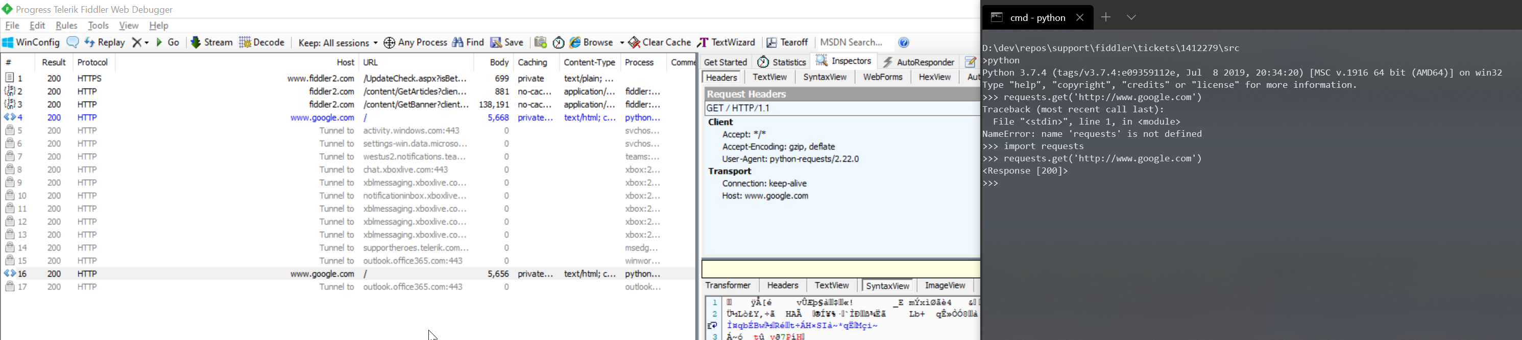 If I use Chrome to browse the web, I see plenty of sessions in Fiddler. The call to the requests library in python to get www.google.com however does not show up in Fiddler. Python is running in a cmd window.