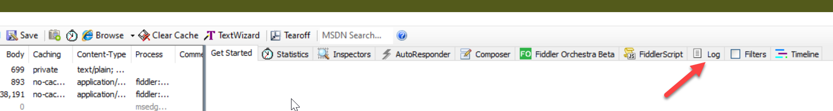 There are a couple of ways to get information about web sessions. The Fiddler Log Tab is the first location that provides more information about how Fiddler is operating. This located in the Right-hand Side of the GUI. See the below screen shot for a visual reference.