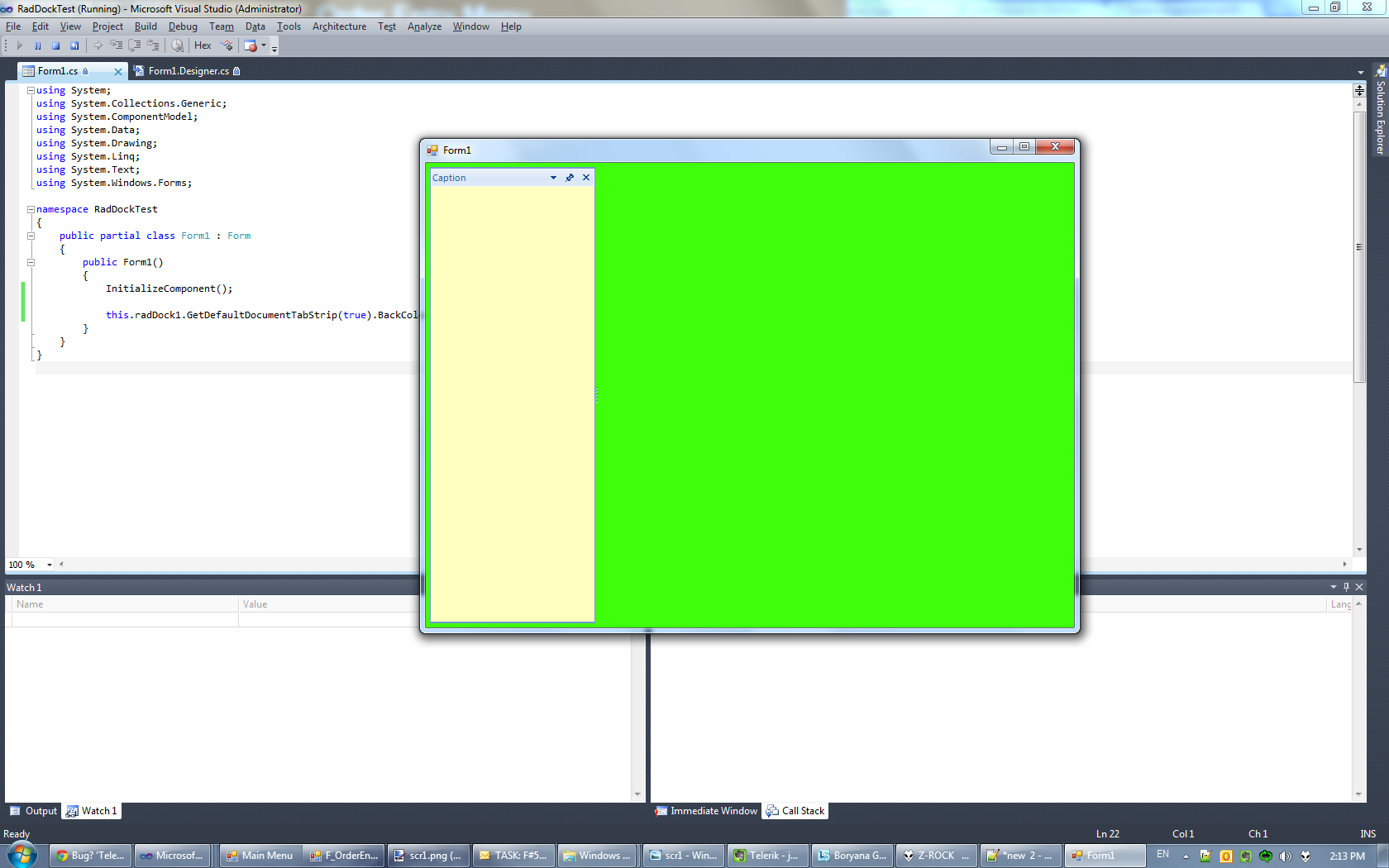 public Form1(){ InitializeComponent(); this.radDock1.GetDefaultDocumentTabStrip(true).BackColor = System.Drawing.Color.FromArgb(((int)(((byte)(63)))), ((int)(((byte)(255)))), ((int)(((byte)(10)))));}Please view the result in the attached screenshot.