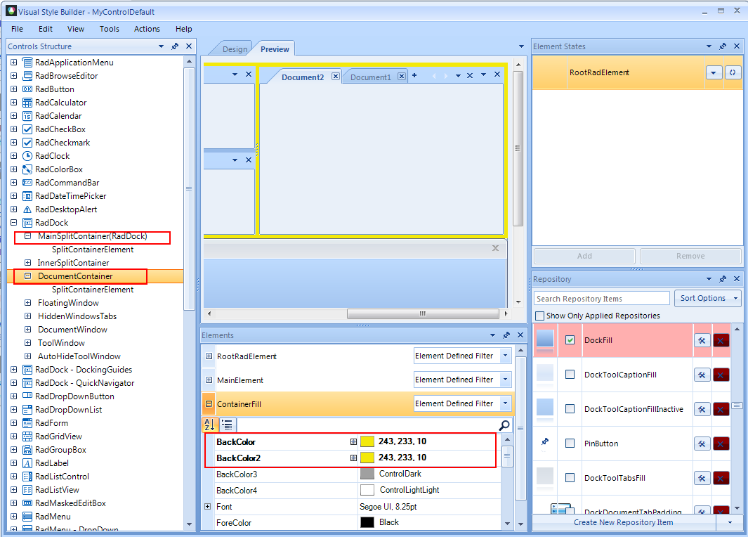public Form1(){ InitializeComponent(); ThemeResolutionService.LoadPackageFile("C:\\MyControlDefault.tssp"); this.radDock1.ThemeName = "MyControlDefault";}To change the properties of the theme, you can use Visual Style Builder. Please view the attached screenshots for the details. I am also attaching the modified ControlDefault theme package.