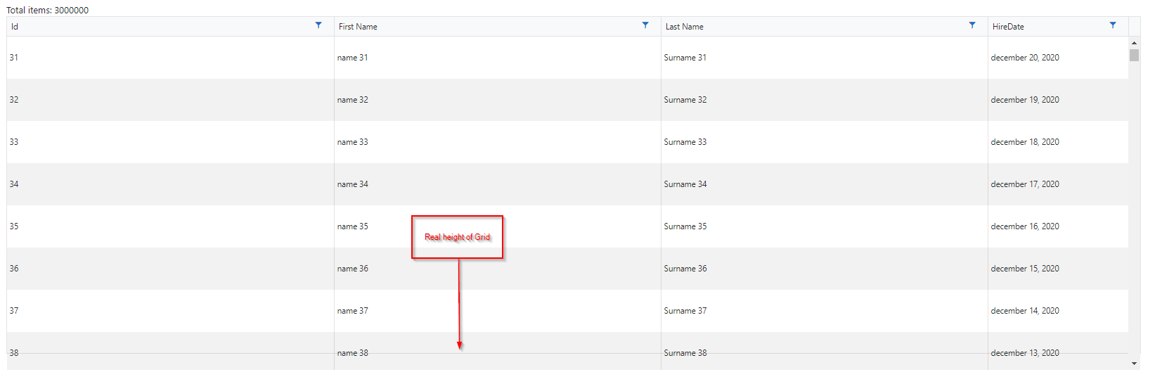 @using Telerik.DataSource.Extensions@attribute [Authorize]Total items: @GridData.Count<TelerikGrid Data=@CurrentPage ScrollMode="@GridScrollMode.Virtual" Height="480px" RowHeight="60" PageSize="20" Sortable="true" FilterMode="@GridFilterMode.FilterMenu" OnRead="@OnReadHandler" TotalCount="@Total"> <GridColumns> <GridColumn Field="Id" /> <GridColumn Field="Name" Title="First Name" /> <GridColumn Field="LastName" Title="Last Name" /> <GridColumn Field="HireDate" Width="200px" DisplayFormat="{0:MMMM dd, yyyy}" /> </GridColumns></TelerikGrid>@code { public List<SampleData> GridData { get; set; } public IEnumerable<SampleData> CurrentPage { get; set; } int Total { get; set; } async Task OnReadHandler(GridReadEventArgs e) { GridData = await GetData(); var result = await GridData.ToDataSourceResultAsync(e.Request); CurrentPage = result.Data as IEnumerable<SampleData>; Total = result.Total; await InvokeAsync(StateHasChanged); } protected override async Task OnInitializedAsync() { GridData = new List<SampleData>(); } private async Task<List<SampleData>> GetData() { return Enumerable.Range(1, 3000000).Select(x => new SampleData { Id = x, Name = $"name {x}", LastName = $"Surname {x}", HireDate = DateTime.Now.Date.AddDays(-x % 1000) }).ToList(); } public class SampleData { public int Id { get; set; } public string Name { get; set; } public string LastName { get; set; } public DateTime HireDate { get; set; } }}