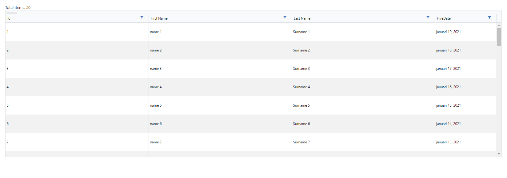 @using Telerik.DataSource.Extensions@attribute [Authorize]Total items: @GridData.Count<TelerikGrid Data=@CurrentPage ScrollMode="@GridScrollMode.Virtual" Height="480px" RowHeight="60" PageSize="20" Sortable="true" FilterMode="@GridFilterMode.FilterMenu" OnRead="@OnReadHandler" TotalCount="@Total"> <GridToolBar> <GridCommandButton Icon="@IconName.Reload"></GridCommandButton> </GridToolBar> <GridColumns> <GridColumn Field="Id"/> <GridColumn Field="Name" Title="First Name"/> <GridColumn Field="LastName" Title="Last Name"/> <GridColumn Field="HireDate" Width="200px" DisplayFormat="{0:MMMM dd, yyyy}"/> </GridColumns></TelerikGrid>@code { public List<SampleData> GridData { get; set; } public IEnumerable<SampleData> CurrentPage { get; set; } int Total { get; set; } async Task OnReadHandler(GridReadEventArgs e) { GridData = await GetData(); var result = await GridData.ToDataSourceResultAsync(e.Request); CurrentPage = result.Data as IEnumerable<SampleData>; Total = result.Total; await InvokeAsync(StateHasChanged); } protected override async Task OnInitializedAsync() { GridData = new List<SampleData>(); } private async Task<List<SampleData>> GetData() { return Enumerable.Range(1, 50).Select(x => new SampleData { Id = x, Name = $"name {x}", LastName = $"Surname {x}", HireDate = DateTime.Now.Date.AddDays(-x % 1000) }).ToList(); } public class SampleData { public int Id { get; set; } public string Name { get; set; } public string LastName { get; set; } public DateTime HireDate { get; set; } }}Hi Wim,