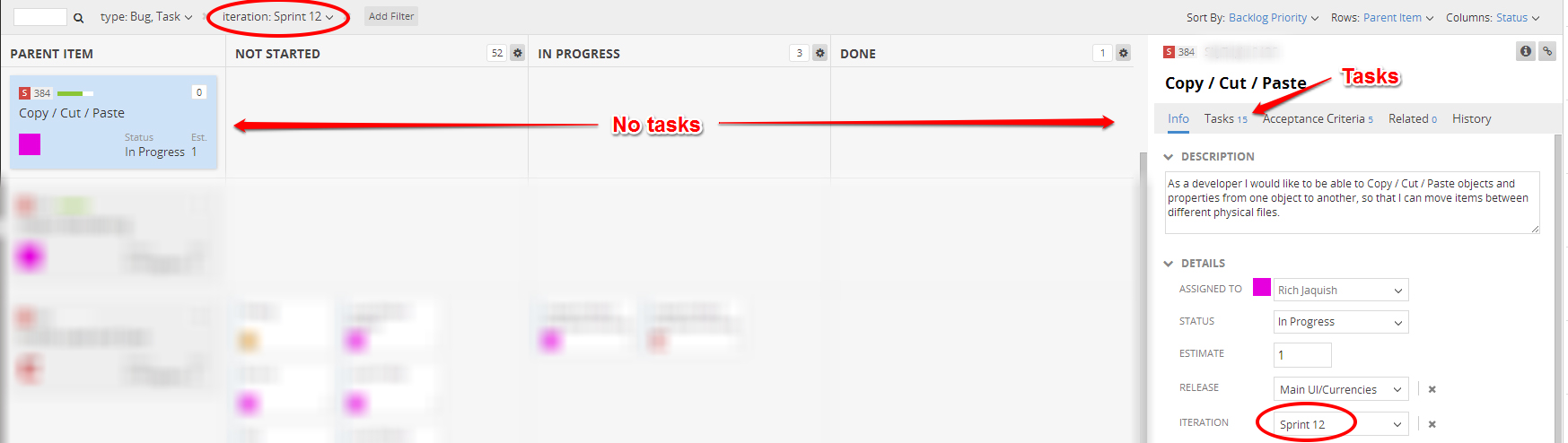 My team just completed a sprint where we set a story to done, then found out later that the story was actually not done. We moved the story to the new iteration and set the story status to "In Progress". However, in the new iteration, none of the tasks for the story show up on the task board. We eventually found that we had to include the previous iteration in the view in order to see the tasks from that story on the task board, even though the story is now on the new iteration.