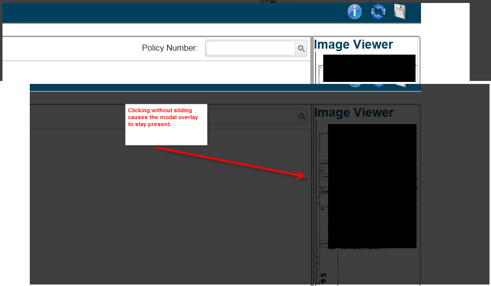 If I use the keyboard to navigate and resize the splitter the modal overlay is not present. This only happens on a mouse click.