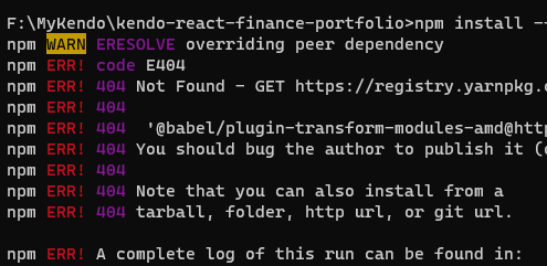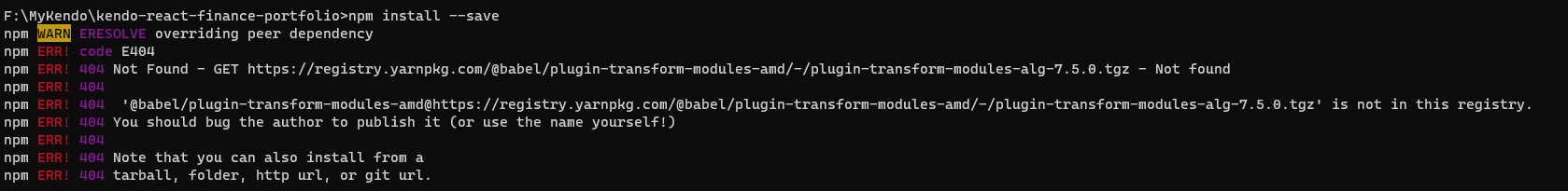 Thank you for the full error message. Based on the message it seems a package is not found in the registry: