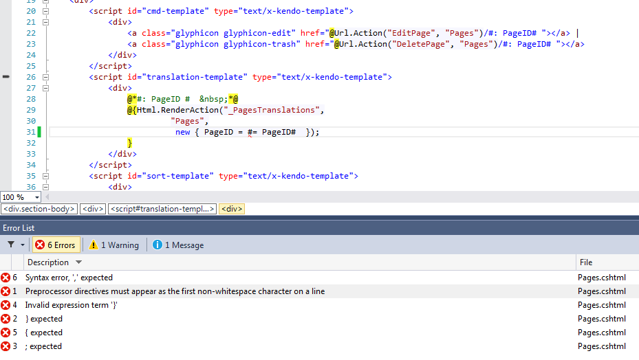 <script id="translation-template" type="text/x-kendo-template"> <div>#: PageID #</div> <div> @{Html.RenderAction("_TranslationTemplate", "Pages", new { PageID = 4 }); } </div> </script>