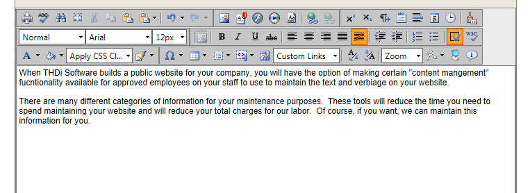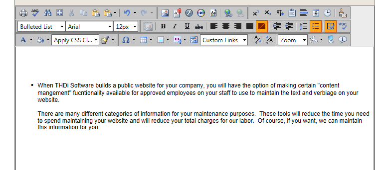 <span style="font-family: arial; font-size: 12px;"><p> </p></span><p> </p><ul> <li><span style="font-family: arial; font-size: 12px;">When THDi Software builds a public website for your company, you will have the option of making certain "content mangement" fucntionality available for approved employees on your staff to use to maintain the text and verbiage on your website.<br /> <br /> There are many different categories of information for your maintenance purposes. These tools will reduce the time you need to spend maintaining your website and will reduce your total charges for our labor. Of course, if you want, we can maintain this information for you.<br /> <br /> </span></li></ul>Is there a problem with the Editor? Why, with all of the carriage returns included in the text, did it go back to the first paragraph and create a bullet item?