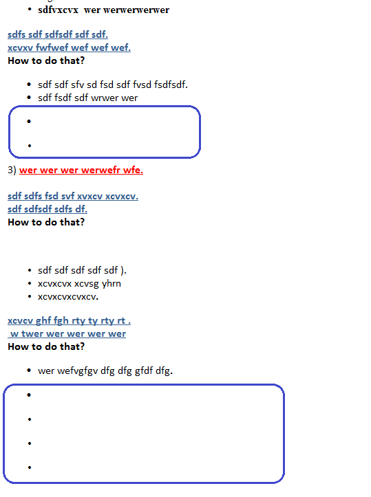 <p><span style="font-family: calibri;">2) <span style="color: #000000; font-size: 11pt;"><strong><span style="color: #ff0000; text-decoration: underline;">ssdfsdfsxcvx vsvs sdfsfdsdf sdf sdf</span></strong></span><span style="font-family: calibri; color: #ff0000; font-size: 11pt;"><strong><span style="text-decoration: underline;">.<br /> </span></strong></span></span><span style="font-family: calibri; color: #366092; text-decoration: underline;"><br /> <strong>xxcv xcvxcv x cxvr r er er er er er erg .</strong></span><span style="font-family: calibri;"><br /> <span style="color: #366092;"><strong><span style="text-decoration: underline;">g dfgdfg dfg dfg df trrterertergt ergt.</span></strong></span><span style="color: #366092;"><strong><span style="text-decoration: underline;"><br /> </span></strong></span></span><b><span style="font-family: calibri; color: #000000;">How to do that?</span></b></p> <ul> <li><span style="color: #000000;"><span style="color: #000000; font-size: 11pt;">gdfgdfg df </span>.</span> </li> <li><span style="font-family: calibri; color: #000000; font-size: 11pt;">dfgdfg dfg dfg dg .</span> </li> <li><span style="font-family: calibri;">sfsdfsdfsdfsdfsdf</span> </li> <li><span style="font-family: calibri; color: #000000; font-size: 11pt;"><span style="color: #000000; font-size: 11pt;">dfsdfsdfmstscsdf type sdfsdf</span><strong>.</strong></span> </li> <li><span style="color: #000000; font-size: 11pt;">sdgcbvxcvxcv</span> </li> <li><span style="color: #000000; font-size: 11pt;"><strong>sdfvxcvx wer werwerwerwer</strong></span> </li> </ul> <span style="color: #000000; font-size: 11pt;"> <p class="Description" style="margin: 5.25pt 0in;"><span style="font-family: calibri;"><strong><span style="color: #366092; text-decoration: underline;">sdfs sdf sdfsdf sdf sdf.</span></strong><br /> </span><span style="font-family: calibri;"><span style="color: #366092;"><strong><span style="text-decoration: underline;">xcvxv fwfwef wef wef wef.</span></strong><br /> </span><span style="color: #000000;"><strong>How to do that?</strong> <ul> <li><span style="color: #000000; font-size: 11pt;">sdf sdf sfv sd fsd sdf fvsd fsdfsdf.</span> </li> <li><span style="color: #000000; font-size: 11pt;">sdf fsdf sdf wrwer wer </span></li> </ul> </span> <ul> <li></li> </ul> </span></p> <p> </p> <ul> <li></li> </ul> <p><span style="color: #000000; font-size: 11pt;"><span style="font-family: calibri;">3) <span style="color: #000000; font-size: 11pt;"><strong><span style="color: #ff0000; text-decoration: underline;">wer wer wer werwefr wfe.</span></strong></span><span style="font-family: calibri; color: #ff0000; font-size: 11pt;"><strong><span style="text-decoration: underline;"><br /> </span></strong></span></span><span style="font-family: calibri; color: #366092; text-decoration: underline;"><br /> <strong>sdf sdfs fsd svf xvxcv xcvxcv.</strong></span><span style="font-family: calibri;"><br /> <span style="color: #366092;"><strong><span style="text-decoration: underline;">sdf sdfsdf sdfs df.</span></strong></span><span style="color: #366092;"><strong><span style="text-decoration: underline;"><br /> </span></strong></span></span><b><span style="font-family: calibri; color: #000000;">How to do that?</span></b> <p> </p> <ul> <li><span style="font-family: calibri; color: #000000; font-size: 11pt;">sdf sdf sdf sdf sdf ).</span> </li> <li><span style="font-family: calibri;">xcvxcvx xcvsg yhrn</span> </li> <li><span style="font-family: calibri; color: #000000; font-size: 11pt;"><span style="color: #000000; font-size: 11pt;">xcvxcvxcvxcv</span><strong>.</strong></span> </li> </ul> <span style="color: #000000; font-size: 11pt;"> <p><span style="font-family: calibri;"><strong><span style="color: #366092; text-decoration: underline;">xcvcv ghf fgh rty ty rty rt .</span></strong><br /> </span><span style="font-family: calibri;"><span style="color: #366092;"><strong><span style="text-decoration: underline;"> w twer wer wer wer wer<br /> </span></strong></span><span style="color: #000000;"><strong>How to do that?</strong> <ul> <li><span style="font-family: calibri; color: #000000; font-size: 11pt;"><span style="color: #000000; font-size: 11pt;">wer wefvgfgv dfg dfg gfdf dfg</span><strong>.</strong></span> </li> </ul> </span> <ul> <li></li> </ul> </span></p> <p> </p> <ul> <li></li> </ul> </span> <ul> <li></li> </ul> </span></p> <p> </p> <ul> <li></li> </ul> <p> </p> </span>The problem is that the radeditor control generates new bullets (Please, view the attached screen-shot).