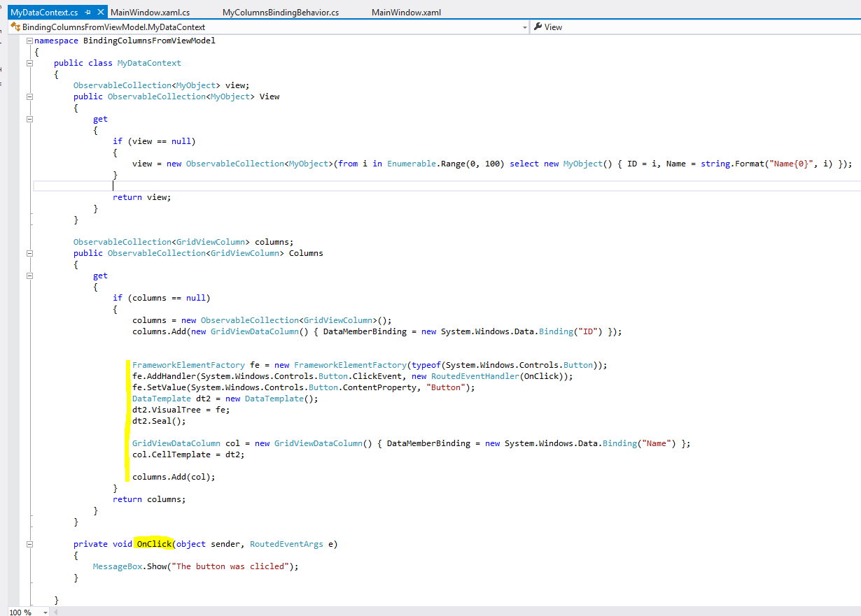 public ObservableCollection<GridViewColumn> Columns<br> {<br> get<br> {<br> if (columns == null)<br> {<br> columns = new ObservableCollection<GridViewColumn>();<br> columns.Add(new GridViewDataColumn() { DataMemberBinding = new System.Windows.Data.Binding("ID") });<br><br><br> FrameworkElementFactory fe = new FrameworkElementFactory(typeof(System.Windows.Controls.Button));<br> fe.AddHandler(System.Windows.Controls.Button.ClickEvent, new RoutedEventHandler(OnClick));<br> fe.SetValue(System.Windows.Controls.Button.ContentProperty, "Button");<br> DataTemplate dt2 = new DataTemplate();<br> dt2.VisualTree = fe;<br> dt2.Seal();<br><br> GridViewDataColumn col = new GridViewDataColumn() { DataMemberBinding = new System.Windows.Data.Binding("Name") };<br> col.CellTemplate = dt2;<br><br> columns.Add(col);<br> }<br> return columns;<br> }<br> }<br><br> private void OnClick(object sender, RoutedEventArgs e)<br> {<br> MessageBox.Show("The button was clicled");<br> }How to get Clicked Event?