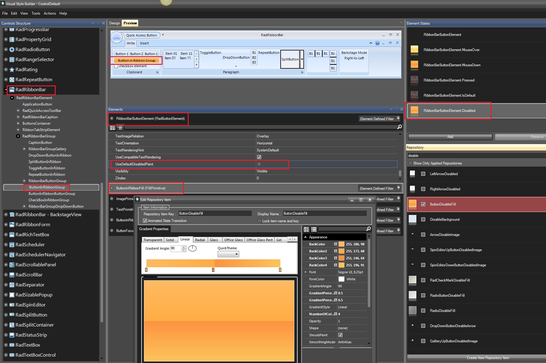 If your requirement is to modify disabled state for the ButtonInRibbonGroup, it is necessary to disable UseDefaultDisabledPaint for the RibbonBarButtonElement and specify the desired fill for the ButtonInRibbonFill in the Visual Style Builder. Please find attached a sample picture, illustrating more precisely my point. Then the custom theme should be applied for the desired button or to the entire application, depending on your specific case.