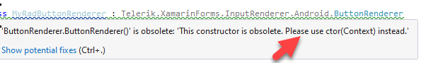 Xamarin Exception Stack: System.NotSupportedException: Unable to activate instance of type Telerik.XamarinForms.InputRenderer.Android.Button.ExtendedAndroidButton from native handle 0xbef5af20 (key_handle 0x7b876d1). at Java.Interop.TypeManager.CreateInstance (System.IntPtr handle, Android.Runtime.JniHandleOwnership transfer, System.Type targetType) [0x00182] in <20c7915d69a7451ba5dddbb52e8ee0c2>:0 at Java.Lang.Object.GetObject (System.IntPtr handle, Android.Runtime.JniHandleOwnership transfer, System.Type type) [0x000c1] in <20c7915d69a7451ba5dddbb52e8ee0c2>:0 at Java.Lang.Object._GetObject[T] (System.IntPtr handle, Android.Runtime.JniHandleOwnership transfer) [0x00017] in <20c7915d69a7451ba5dddbb52e8ee0c2>:0 at Java.Lang.Object.GetObject[T] (System.IntPtr handle, Android.Runtime.JniHandleOwnership transfer) [0x00000] in <20c7915d69a7451ba5dddbb52e8ee0c2>:0 at Android.Views.View+IOnClickListenerInvoker.n_OnClick_Landroid_view_View_ (System.IntPtr jnienv, System.IntPtr native__this, System.IntPtr native_v) [0x00009] in <20c7915d69a7451ba5dddbb52e8ee0c2>:0 at (wrapper dynamic-method) Android.Runtime.DynamicMethodNameCounter.44(intptr,intptr,intptr) --- End of inner exception stack trace --- System.MissingMethodException: No constructor found for Telerik.XamarinForms.InputRenderer.Android.Button.ExtendedAndroidButton::.ctor(System.IntPtr, Android.Runtime.JniHandleOwnership) at Java.Interop.TypeManager.CreateProxy (System.Type type, System.IntPtr handle, Android.Runtime.JniHandleOwnership transfer) [0x00055] in <20c7915d69a7451ba5dddbb52e8ee0c2>:0 at Java.Interop.TypeManager.CreateInstance (System.IntPtr handle, Android.Runtime.JniHandleOwnership transfer, System.Type targetType) [0x00116] in <20c7915d69a7451ba5dddbb52e8ee0c2>:0 --- End of inner exception stack trace --- Java.Interop.JavaLocationException: Exception of type 'Java.Interop.JavaLocationException' was thrown. at Java.Lang.Error: Exception of type 'Java.Lang.Error' was thrown. at java.lang.Error: Java callstack: at md51558244f76c53b6aeda52c8a337f2c37.ButtonRenderer_ButtonClickListener.n_onClick(Native Method) at md51558244f76c53b6aeda52c8a337f2c37.ButtonRenderer_ButtonClickListener.onClick(ButtonRenderer_ButtonClickListener.java:30) at android.view.View.performClick(View.java:6300) at android.view.View$PerformClick.run(View.java:24941) at android.os.Handler.handleCallback(Handler.java:790) at android.os.Handler.dispatchMessage(Handler.java:99) at android.os.Looper.loop(Looper.java:164) at android.app.ActivityThread.main(ActivityThread.java:6639) at java.lang.reflect.Method.invoke(Native Method) at com.android.internal.os.RuntimeInit$MethodAndArgsCaller.run(RuntimeInit.java:583) at com.android.internal.os.ZygoteInit.main(ZygoteInit.java:870)