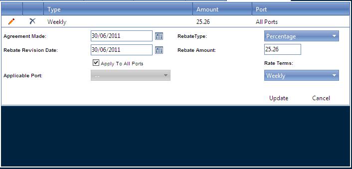 <EditFormSettings EditFormType="Template"> <FormTemplate> <table style="width: 100%;"> <tr> <td align="left" width="25%"> <asp:Label ID="MadeDteLabel" runat="server" Font-Bold="True" Font-Names="Arial" Font-Size="X-Small" Text="Agreement Made:"></asp:Label> </td> <td align="left" width="25%"> <telerik:RadDatePicker ID="MadeDatePicker" runat="server" Skin="Web20"> <Calendar runat="server" UseRowHeadersAsSelectors="False" UseColumnHeadersAsSelectors="False" ViewSelectorText="x" Skin="Web20"> </Calendar> <DateInput runat="server" DisplayDateFormat="dd/MM/yyyy" DateFormat="dd/MM/yyyy"> </DateInput> <DatePopupButton ImageUrl="" HoverImageUrl=""></DatePopupButton> </telerik:RadDatePicker> </td> <td align="left" width="25%"> <asp:Label ID="Label2" runat="server" Font-Bold="True" Font-Names="Arial" Font-Size="X-Small" Text="RebateType:"></asp:Label> </td> <td align="left" colspan="2" width="25%"> <telerik:RadComboBox ID="RebTypComboBox" runat="server" DataTextField="rebateType" DataValueField="rebateTypeID" Skin="Web20" Width="150px"> <Items> <telerik:RadComboBoxItem runat="server" Text="--" Value="0" Selected="true" /> </Items> </telerik:RadComboBox> </td> </tr> <tr> <td align="left" width="25%"> <asp:Label ID="RevDteLabel" runat="server" Font-Bold="True" Font-Names="Arial" Font-Size="X-Small" Text="Rebate Revision Date:"></asp:Label> </td> <td align="left" width="25%"> <telerik:RadDatePicker ID="RevDatePicker" runat="server" Skin="Web20"> <Calendar runat="server" UseRowHeadersAsSelectors="False" UseColumnHeadersAsSelectors="False" ViewSelectorText="x" Skin="Web20"> </Calendar> <DateInput runat="server" DisplayDateFormat="dd/MM/yyyy" DateFormat="dd/MM/yyyy"> </DateInput> <DatePopupButton ImageUrl="" HoverImageUrl=""></DatePopupButton> </telerik:RadDatePicker> </td> <td align="left" width="25%"> <asp:Label ID="Label1" runat="server" Font-Bold="True" Font-Names="Arial" Font-Size="X-Small" Text="Rebate Amount:"></asp:Label> </td> <td align="left" colspan="2" width="25%"> <telerik:RadNumericTextBox ID="RebateAmt" runat="server" Text='<%# Bind("rebate_amount") %>' Skin="Web20" Width="70px"> </telerik:RadNumericTextBox> </td> </tr> <tr> <td align="left" width="25%"> </td> <td align="left" width="25%"> <asp:CheckBox ID="AgentRebApplyAllCB" runat="server" AutoPostBack="true" Font-Names="Arial" Font-Size="X-Small" OnCheckedChanged="AgentRebApplyAllCB_CheckedChanged" Text="Apply To All Ports" /> </td> <td align="left" width="25%"> </td> <td align="left" colspan="2" width="25%"> <asp:Label ID="RebORLabel0" runat="server" Font-Bold="True" Font-Names="Arial" Font-Size="X-Small" Text="Rate Terms:"></asp:Label> </td> </tr> <tr> <td align="left" width="25%"> <asp:Label ID="RebAPLabel" runat="server" Font-Bold="True" Font-Names="Arial" Font-Size="X-Small" Text="Applicable Port:"></asp:Label> </td> <td align="left" width="25%"> <telerik:RadComboBox ID="RebAppPortComboBox" runat="server" Skin="Web20"> </telerik:RadComboBox> </td> <td align="left" width="25%"> </td> <td align="left" colspan="2" width="25%"> <telerik:RadComboBox ID="RebTermComboBox" runat="server" DataTextField="term_type" DataValueField="termID" Skin="Web20" Width="150px"> <Items> <telerik:RadComboBoxItem runat="server" Text="--" Value="0" Selected="true" /> <telerik:RadComboBoxItem runat="server" Text="Weekly" Value="1" /> <telerik:RadComboBoxItem runat="server" Text="Monthly" Value="2" /> <telerik:RadComboBoxItem runat="server" Text="Quaterly" Value="3" /> <telerik:RadComboBoxItem runat="server" Text="Half Year" Value="4" /> <telerik:RadComboBoxItem runat="server" Text="Yearly" Value="5" /> </Items> </telerik:RadComboBox> </td> </tr> <tr> <td align="left" width="25%"> </td> <td align="left" width="25%"> </td> <td align="left" width="25%"> </td> <td align="left" colspan="2" width="25%"> </td> </tr> <tr> <td align="left" width="25%"> </td> <td align="left" width="25%"> </td> <td align="left" width="25%"> </td> <td align="left" style="width: 12.5%" width="12.5%"> <telerik:RadButton ID="btnUpdate" CommandName='<%# Iif (TypeOf Container is GridEditFormInsertItem, "PerformInsert", "Update") %>' runat="server" Skin="Web20" Text='<%# Iif (TypeOf Container is GridEditFormInsertItem, "Insert", "Update") %>'> </telerik:RadButton> </td> <td align="left" style="width: 12.5%" width="12.5%"> <telerik:RadButton ID="btnCancel" runat="server" Skin="Web20" CausesValidation="false" CommandName="Cancel" Text="Cancel"> </telerik:RadButton> </td> </tr> </table> </FormTemplate> </EditFormSettinAny advice "As Always" would be appriciated.