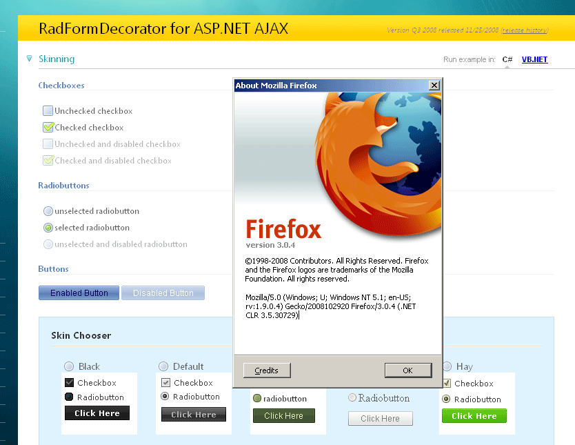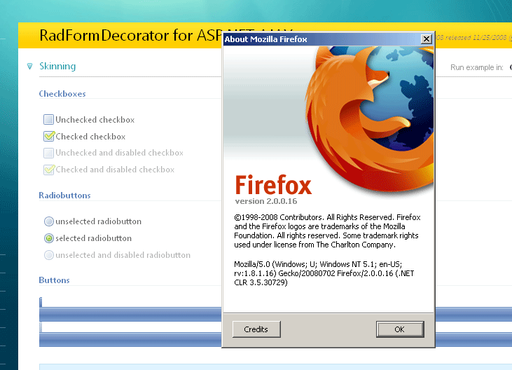 However, there is an issue with FireFox 2.0.0.16, which can be fixed by adding float: left to the skinned buttons. In version 3x FireFox finally implemented the display: inline-block property and this allowed us to remove certain vendor-specific CSS properties from our code, and this is why in some cases issues emerge with older versions of FireFox, but as they release it every 3-4 weeks we decided to drop certain features and to support better CSS, as this allowed decrease in the size of the stylesheets and easier maintenance.