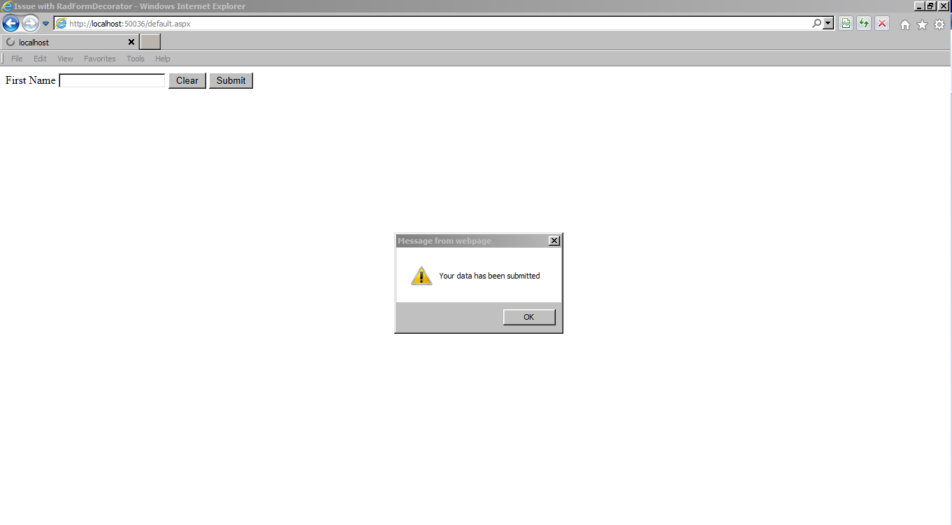 <%@ Page Language="C#" AutoEventWireup="true" CodeBehind="Default.aspx.cs" Inherits="WebApplication1.Appeal" Title="Untitled Page" %><%@ Register Assembly="Telerik.Web.UI" Namespace="Telerik.Web.UI" TagPrefix="telerik" %> <!DOCTYPE html PUBLIC "-//W3C//DTD XHTML 1.0 Transitional//EN" "http://www.w3.org/TR/xhtml1/DTD/xhtml1-transitional.dtd"><html xmlns="http://www.w3.org/1999/xhtml"> <head> <title>Issue with RadFormDecorator</title> </head> <body><telerik:RadFormDecorator ID="rfd1" EnableAjaxSkinRendering="false" DecoratedControls="Buttons, Scrollbars, Select, Textbox, Textarea, Label, ValidationSummary" Runat="server" Skin="Vista"/> <form runat="server"> <telerik:RadScriptManager ID="ScriptManager1" runat="server"/> <asp:Label runat="server" Text="First Name" /> <asp:TextBox runat="server" ID="textbox1" Text="" /> <asp:Button runat="server" ID="button2" Text="Clear" OnClick="btnClear" /> <asp:Button runat="server" ID="button1" Text="Submit" OnClick="btnSubmit" /> </form></body> </html>using System;using System.Collections.Generic;using System.Linq;using System.Web;using System.Text;using System.Web.UI;using Telerik.Web.UI;using System.Data;using System.Collections;using System.Data.SqlClient;namespace WebApplication1{ public partial class Appeal : System.Web.UI.Page { protected void Page_Load(object sender, EventArgs e) { } protected void btnSubmit(object sender, EventArgs e) { ScriptManager.RegisterStartupScript(this, GetType(), "Submit", "alert('Your data has been submitted');", true); } protected void btnClear(object sender, EventArgs e) { } }}0