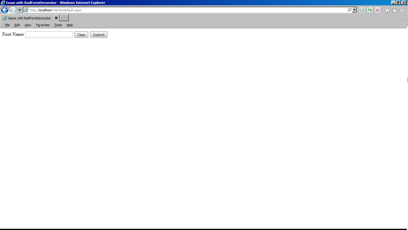 <%@ Page Language="C#" AutoEventWireup="true" CodeBehind="Default.aspx.cs" Inherits="WebApplication1.Appeal" Title="Untitled Page" %><%@ Register Assembly="Telerik.Web.UI" Namespace="Telerik.Web.UI" TagPrefix="telerik" %> <!DOCTYPE html PUBLIC "-//W3C//DTD XHTML 1.0 Transitional//EN" "http://www.w3.org/TR/xhtml1/DTD/xhtml1-transitional.dtd"><html xmlns="http://www.w3.org/1999/xhtml"> <head> <title>Issue with RadFormDecorator</title> </head> <body><telerik:RadFormDecorator ID="rfd1" EnableAjaxSkinRendering="false" DecoratedControls="Buttons, Scrollbars, Select, Textbox, Textarea, Label, ValidationSummary" Runat="server" Skin="Vista"/> <form runat="server"> <telerik:RadScriptManager ID="ScriptManager1" runat="server"/> <asp:Label runat="server" Text="First Name" /> <asp:TextBox runat="server" ID="textbox1" Text="" /> <asp:Button runat="server" ID="button2" Text="Clear" OnClick="btnClear" /> <asp:Button runat="server" ID="button1" Text="Submit" OnClick="btnSubmit" /> </form></body> </html>0