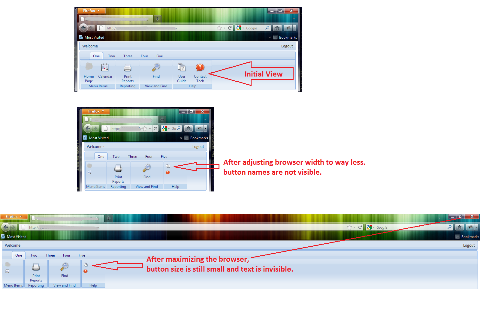 When I resize the browser to very less width. I found the ribbon bar button gets small to adjust with width. But the button text is getting lost.