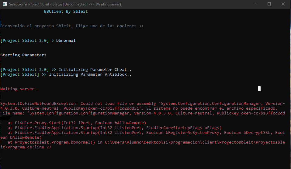 01.FiddlerApplication.Startup(8888, true, true);02. FiddlerApplication.BeforeRequest += (SessionStateHandler)(session =>03. //connect mgame204. {05. if (session.uriContains("mGame2.swf")) 06. {07. session.fullUrl = "http://clientebb-v1.esy.es/BBKids/mGame2.swf"; //example url08. 09. }10. else11. {12. //connect bbkids13. if (!session.uriContains("BBKids.swf"))14. return;15. session.fullUrl = "http://clientebb-v1.esy.es/BBKids/Cheat4.swf"; //example url16. Console.Title = "Script - Status [Connected] <-> [BoomBang.NL]";17. Console.ForegroundColor = ConsoleColor.Green;18. Console.WriteLine("Conectado");19. 20. 21. }22. 23. });
