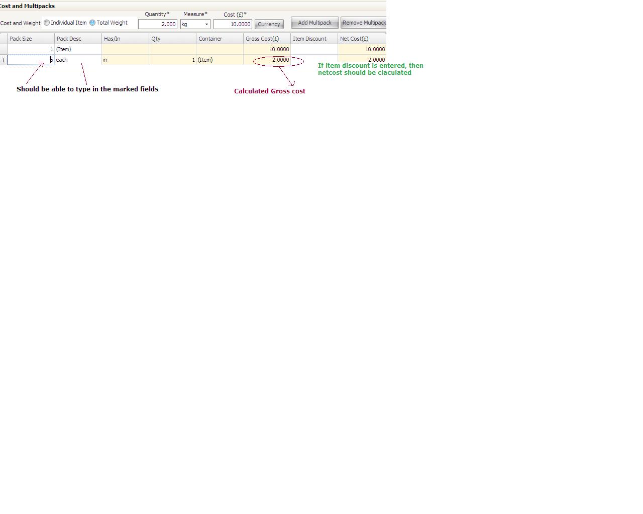 A wireframe has been attached to further explain the issue. As you can see in the image, when a user clicks "add multi pack button", a second row is created in the grid. When user enters the pack size in first cell of second row, it should calculate the gross cost as shown in picture.