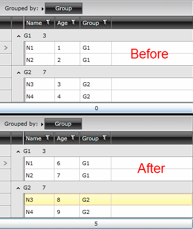 ((IEditableCollectionView)this.clubsGrid.Items).EditItem(person);person.Age += value;((IEditableCollectionView)this.clubsGrid.Items).CommitEdit();}}}This way when the editing is done on the data level, the group aggregate footer will be updated accordingly.